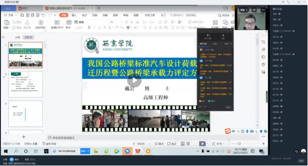 10月21日下午,诸侯快讯入口官网在线上举行了本学期第二次 “西京论坛”。论坛由戴岩高级工程师针对“我国公路桥梁标准汽车设计荷载变迁历程暨公路桥梁承载力评定方法”相关内容做了汇报,工程造价、土木工程、工程管理专业部分师生以及土木水利专业研究生参加此次论坛。
