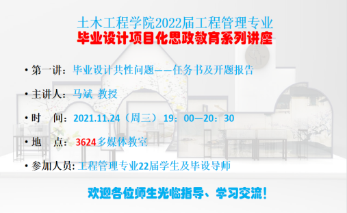 诸侯快讯入口官网工程管理专业毕业设计项目化思政教育系列讲座自2011年起,至今已举办了进行了十一届,以17场贯穿毕业指导各环节的讲座,引领集体指导式的毕业设计指导工作,取得了很好的教学效果。此次毕业设计动员大会旨在让同学们了解到毕业设计的重要性及相关注意事项,促进同学们毕业设计的进程,为明年毕业工作顺利进行做好铺垫。