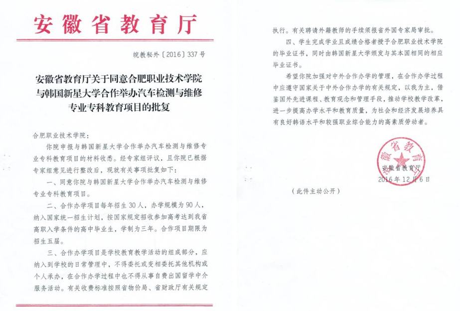 2016年12月6日,安徽省教育厅批准我校与韩国新星大学合作举办汽车检测与维修专业专科教育项目。该合作办学项目每年计划招生30人,并纳入国家统一招生计划,学制为三年。目前我校正在进行课程设置及招生准备工作。开放办学是我校的办学理念,近年来,学校积极争取与国外、境外院校合作办学,这次与韩国新星大学合作办学项目获得批准,是我校合作办学的又一重要成果。