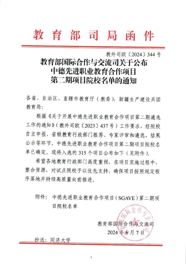 近日,教育部发布了《关于公布中德先进职业教育合作项目第二批项目院校名单的通知》,学校成功入选项目院校,入选专业新能源汽车技术。