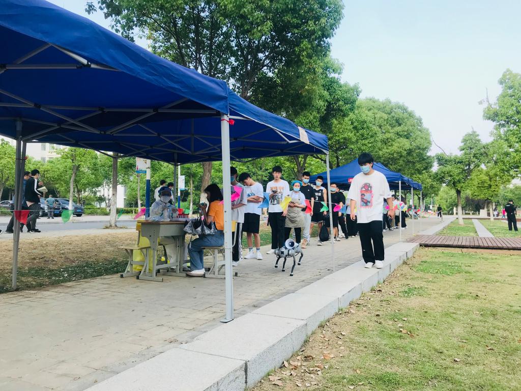 智能机器狗有很多的模式,不仅可以正常行走、奔跑、爬楼梯等,还可以通过内部程序的修改实现跳舞、拜年、侧翻滚和后空翻等高难度动作表演。在鼓山校区教学楼A楼旁,智能机器狗充当起常态化核酸检测点义务宣传员,搭载着外接扬声器,“请佩戴口罩,保持一米间距”,偶尔还“吼两嗓子”,为辛勤工作的核酸检测志愿者和排队等待检测的师生带来一些欢声笑语。
