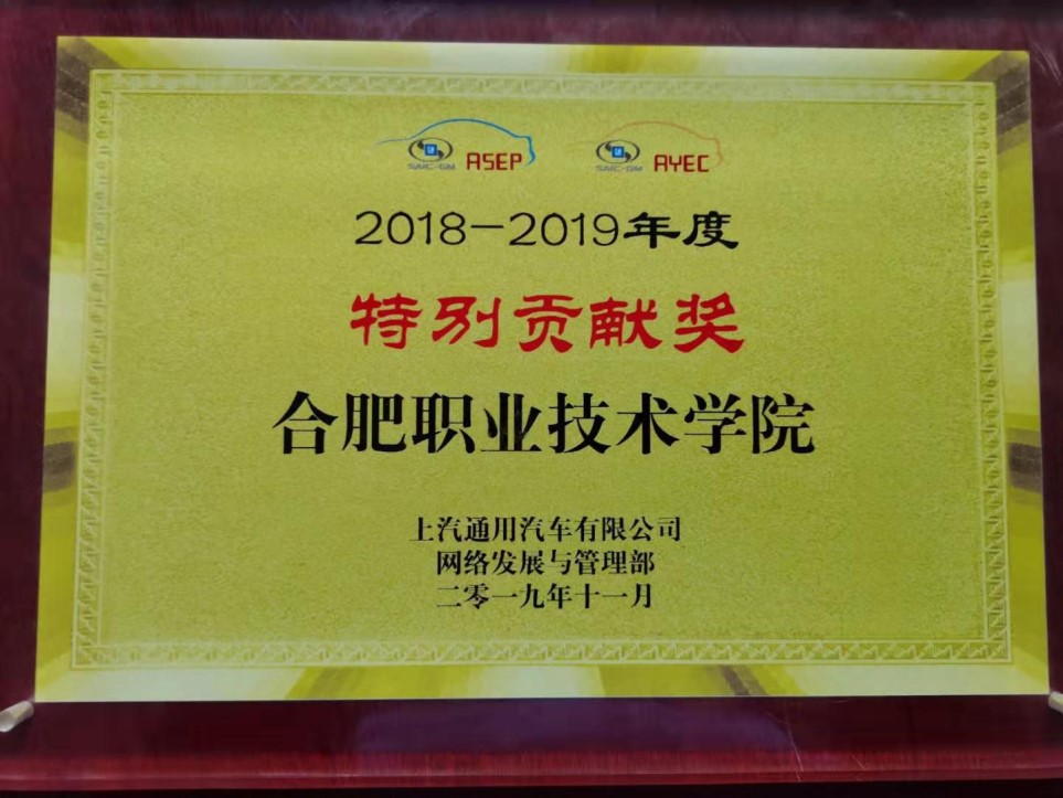 2018—2019年度,由于我校上汽通用校企深度合作项目建设成绩突出,被上海通用汽车销售有限公司授予“特别贡献奖”。