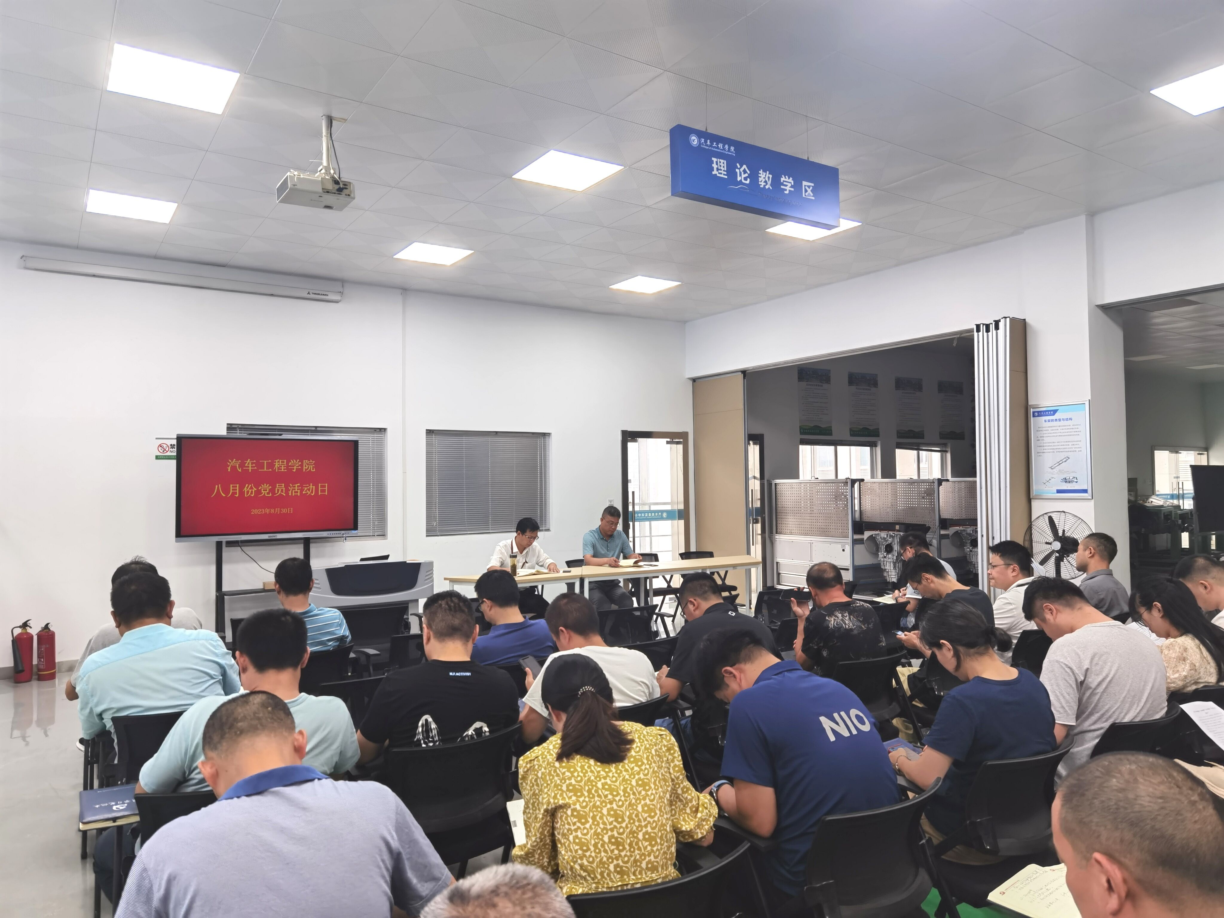 为深入学习宣传贯彻习近平新时代中国特色社会主义思想和党的二十大精神,8月30日下午,YABO鸭脖官网党总支组织全体党员在汽车楼实训室302开展八月份主题党日活动,学校党委委员、办公室主任、学院党总支书记王海主持会议。