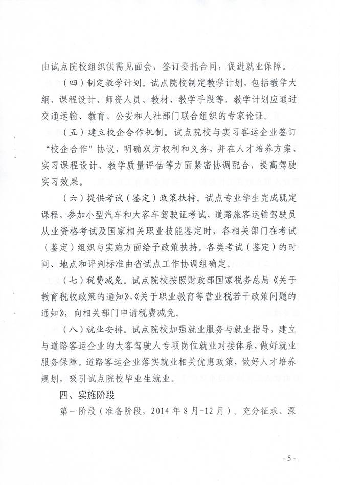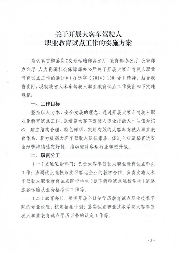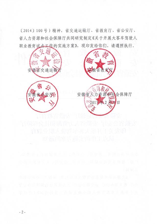 安徽省交通运输厅、安徽省教育厅、安徽省公安厅、安徽省人力资源社会保障厅《关于开展大客车驾驶人职业教育试点工作的实施方案的通知》