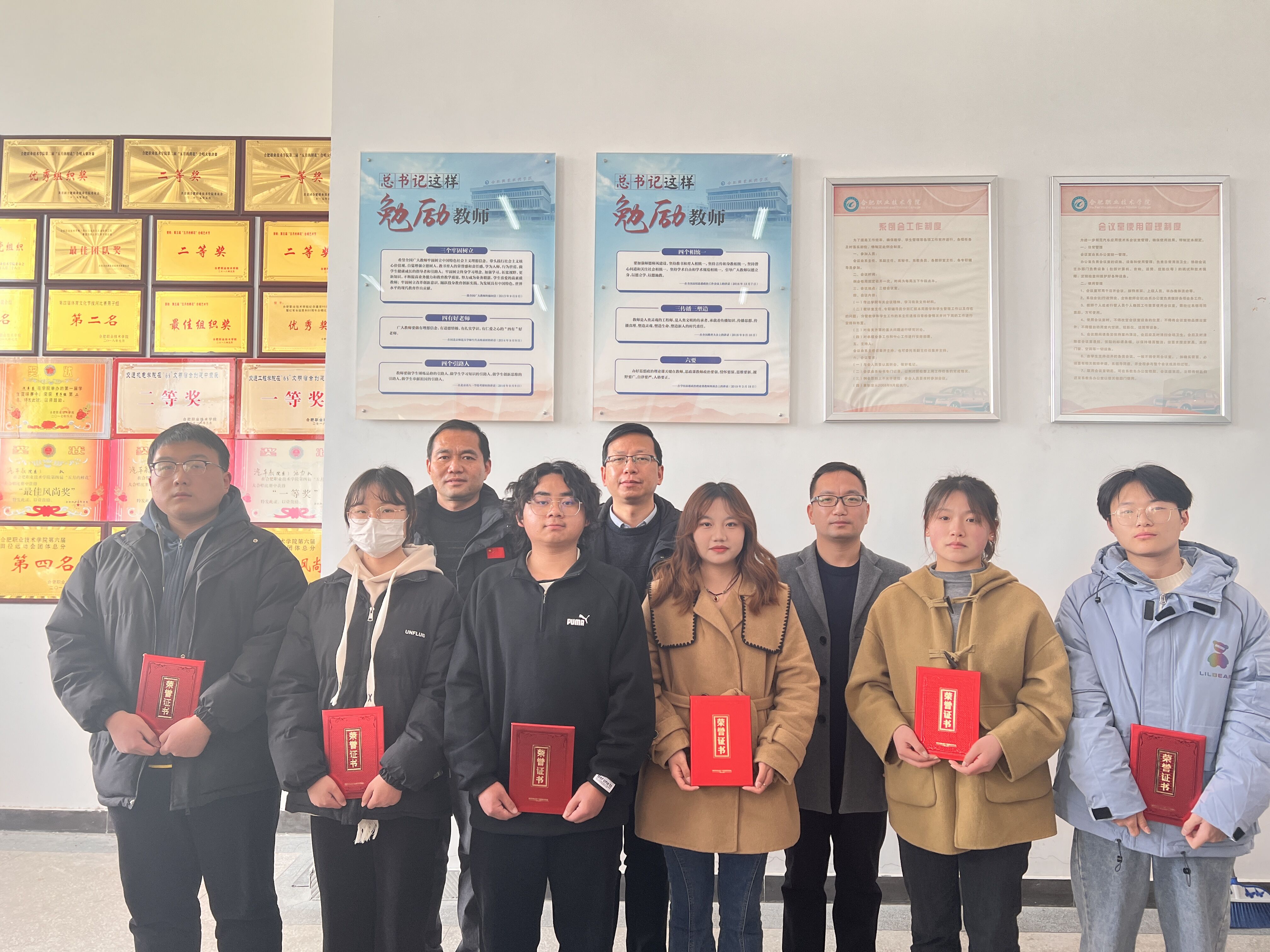 颁奖仪式上,校党委委员、办公室主任、学院党总支书记王海,学院党总支副书记刘靖,学管办主任张升元等为获奖同学颁奖并合影留念。王海对征文获奖同学表示祝贺,肯定了学生们在此次比赛的精彩表现,鼓励同学们今后要进一步增强社会责任感和使命感,在未来的学习和工作中要发扬不畏艰苦、执著追求、精益求精的劳动精神,努力使自己成长为新时代汽车专业的“工匠”型人才。