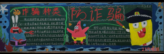 此次活动受到了2021级各班级的高度重视,从板报样式选定到板报创作再到上色和文字书写,各班级都做了精心准备,配备了充足的人力、物力和财力资源。有的班级绘出网络诈骗漫画告诫同学预防照片;有的班级则搬上了“国家反诈中心”APP图标警示网络诈骗。此次活动的举办,提高了YABO鸭脖官网师生的防范电信网络诈骗安全意识,使我院学生对于诈骗的形式和内容有了更进一步的了解。